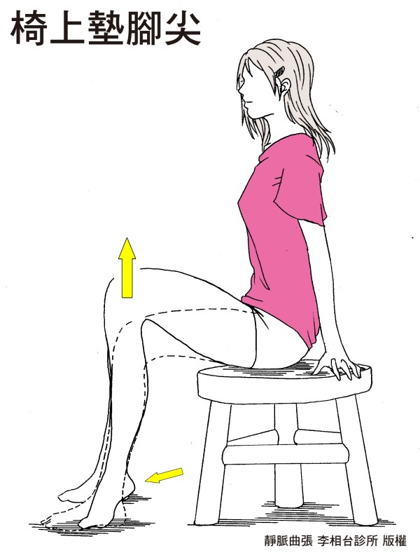 平躺或在沙發上將腿伸直平放,藉由腳板略為施壓向身體的方向弓起和向下壓直的方式,達到強化小腿肌肉幫浦的功能,以預防靜脈曲張的形成。